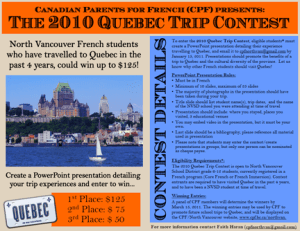 To enter the 2010 Quebec Trip Contest, eligible students* must create a PowerPoint presentation detailing their experience travelling to Quebec, and email it to cpfnorthvan@gmail.com by January 15, 2011. Presentations should promote the benefits of a trip to Quebec and the cultural diversity of the province. Let us know why other French students should visit Quebec!