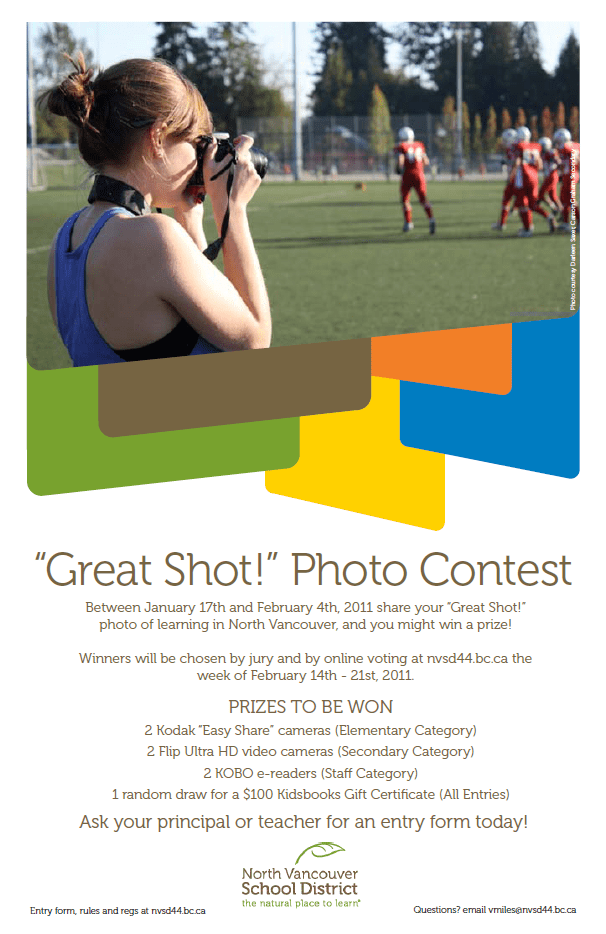 Attention all staff and student shutterbugs! Between January 17th and February 4th, 2011, share a “Great Shot!” of learning in North Vancouver, and you might win one of seven great prizes!