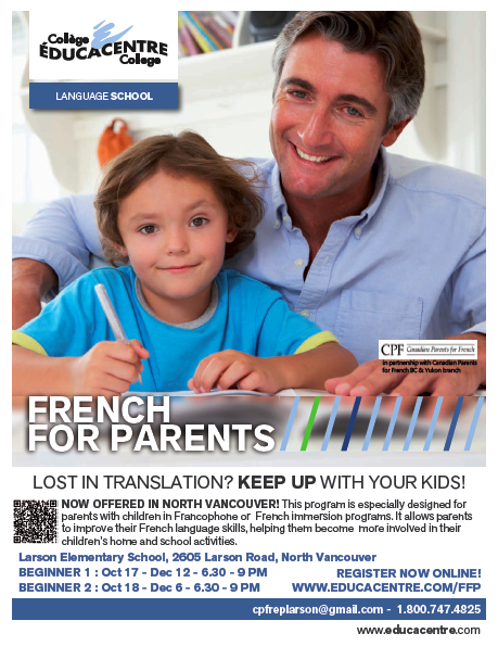 Now being offered in North Vancouver! This program is especially designed for parents with children in Francophone or French immersion programs. It allows parents to improve their French language skills, helping them become more involved in their children’s home and school activities.